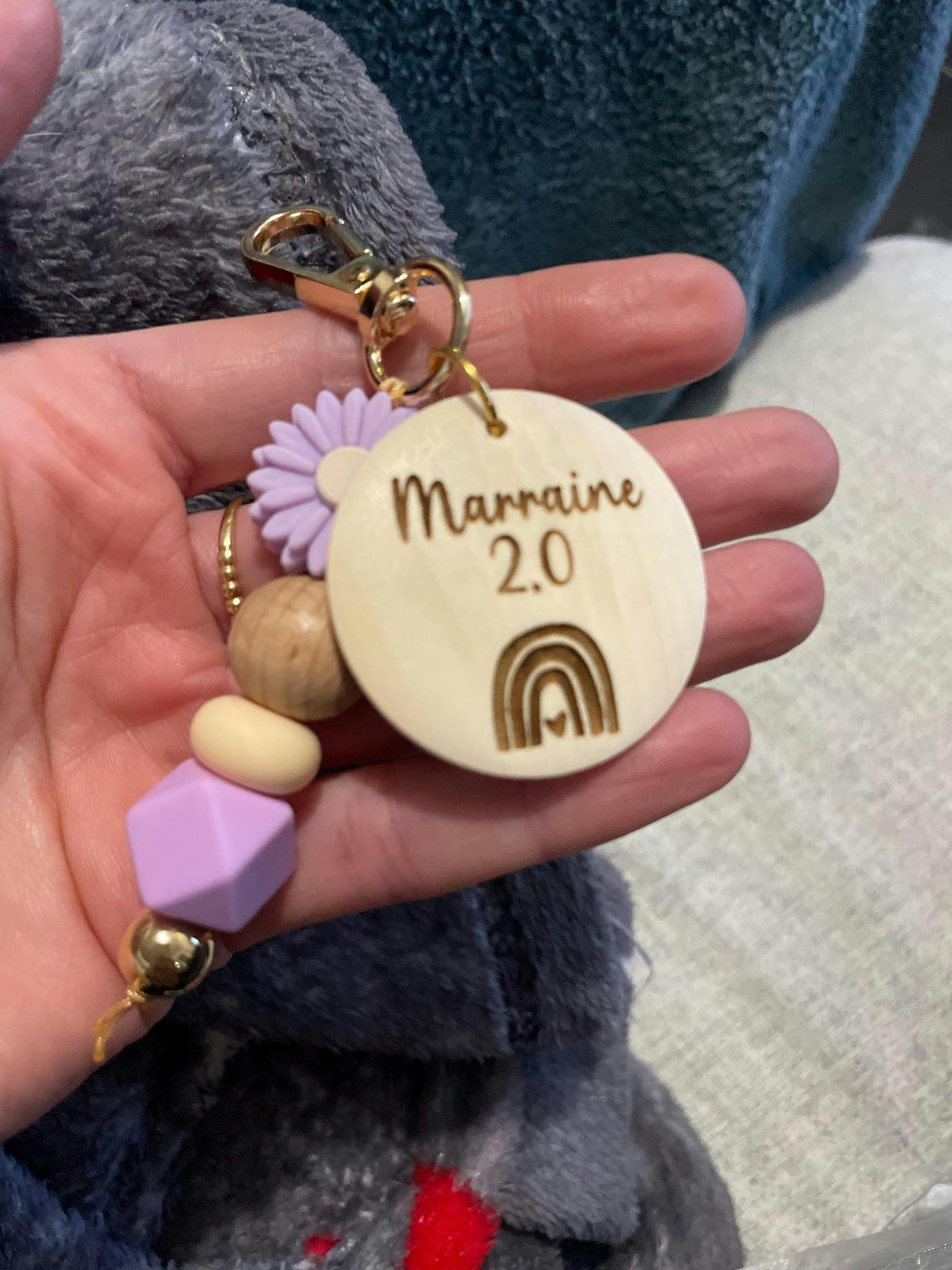 Offrez un porte-clés unique et personnalisé ! Fabriqué avec une fleur en silicone, des billes en bois et un médaillon gravé, ce porte-clés sera un cadeau parfait pour célébrer la fête des mères, un anniversaire ou remercier une maîtresse ou atsem. Personnalisez le pour en faire un souvenir inoubliable !